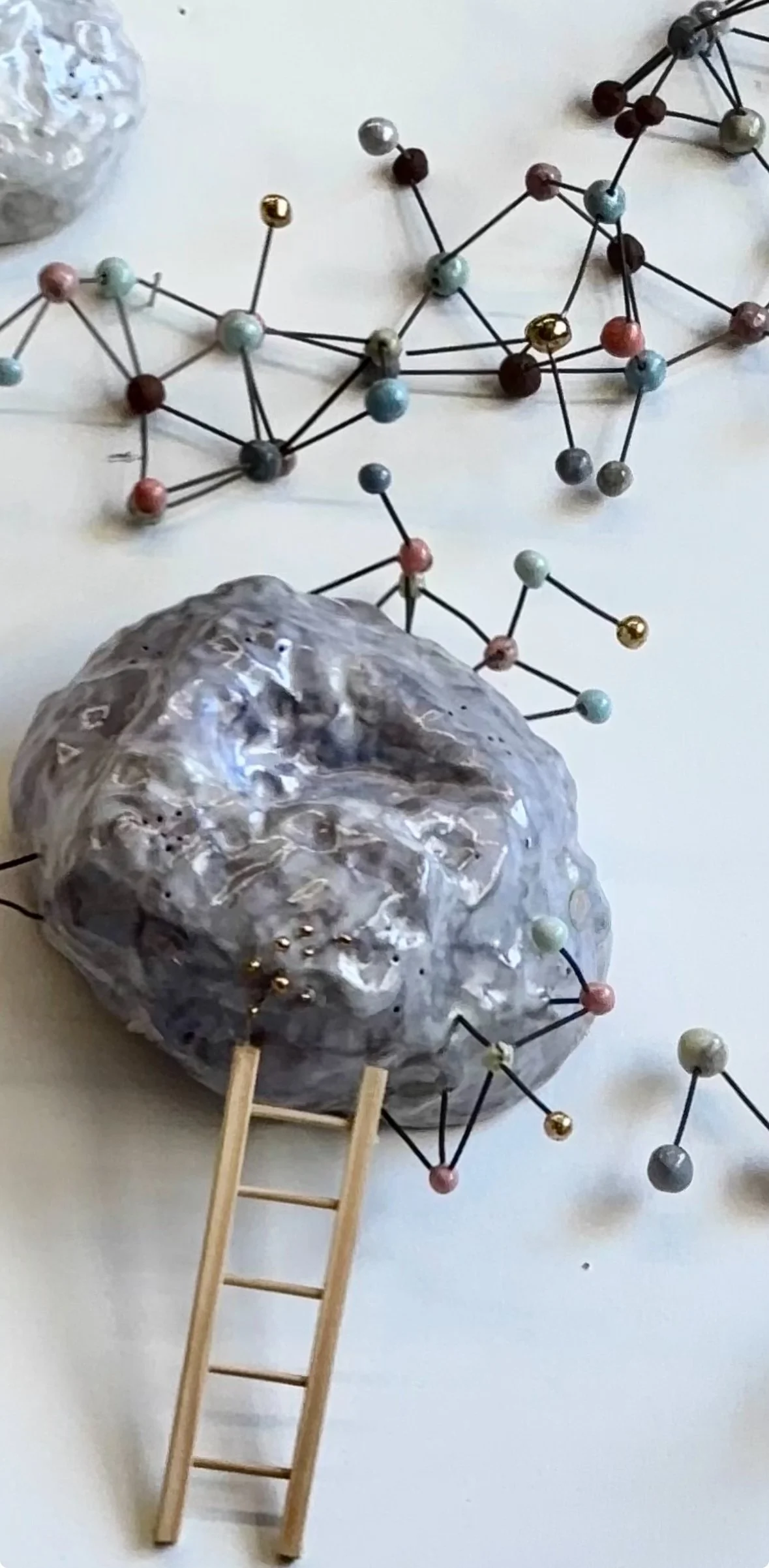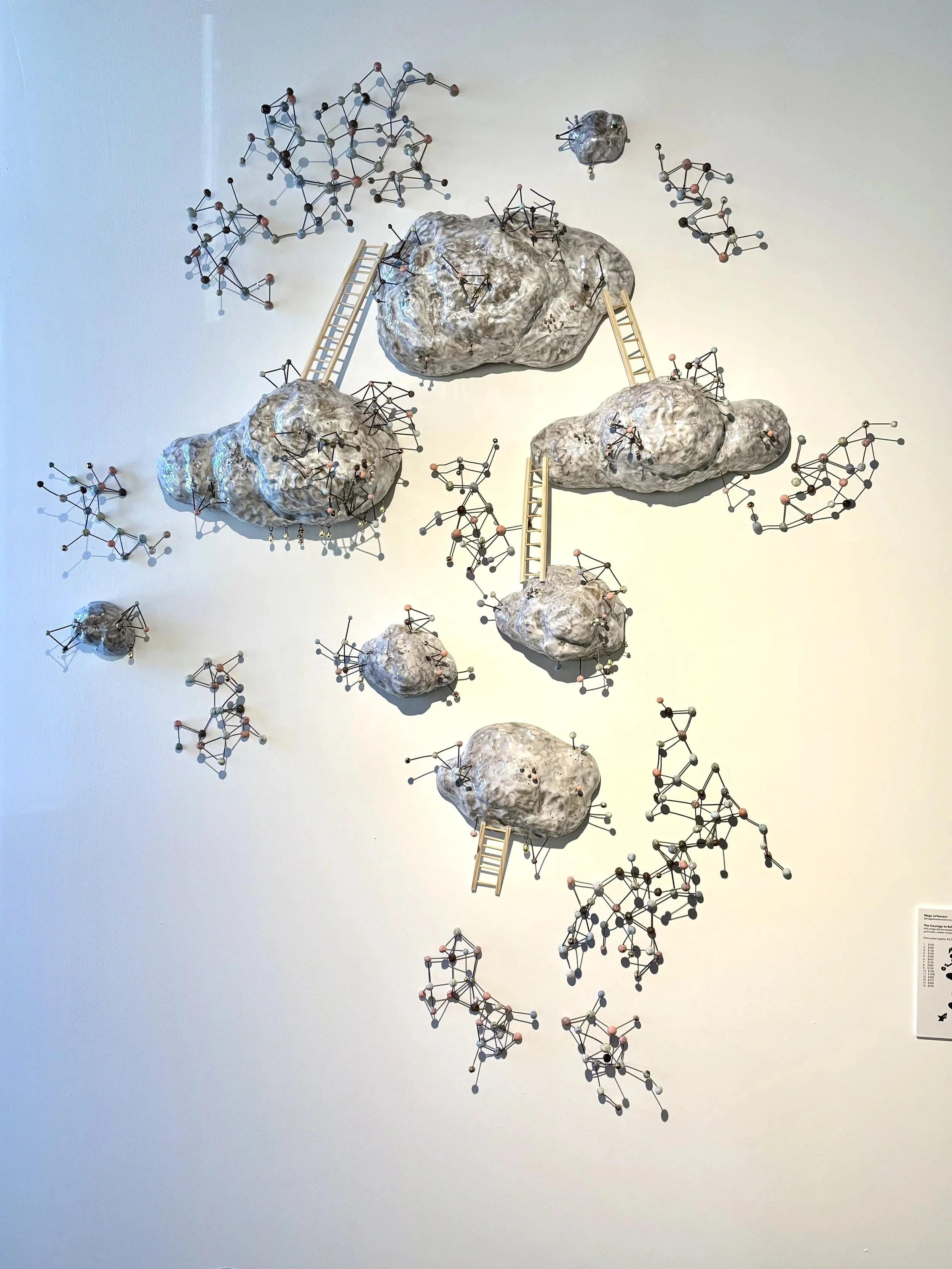 Suspended white ceramic clouds, glazed with an iridescent shimmer, cradle rainbow-hued molecular forms in motion, symbols of transformation within chaos. The playful wooden ladders linking some of the clouds invite both ascent and uncertainty, echoing the steps we take toward healing and rediscovery.